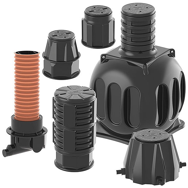 На колодце имеются шесть площадок для ввода/вывода полиэтиленовых труб с различных направлений. Герметичность соединения труб с корпусом колодца осуществляется при помощи адаптеров герметичного ввода. Крышка кабельного колодца имеет резьбовое соединение с корпусом колодца.